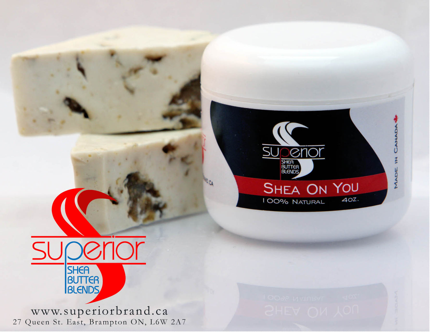 Experience the difference using everyday products made with Grade A Organic Shea Butter and only the finest raw ingredients. Health & Beauty products are available from many sources, but we carry the best quality products which is why our brand is Superior Brand.We are an innovative brand specializing in providing quality Shea Butter products at a reasonable price.SUPERIORBRAND.CA offers a wide range of Shea Butter products of including Shea On You, All Natural Body Butters & Soaps that help ease eczema acne and more. Herbal Teas and a diverse selection of Loose herbs and various items for overall enrichment.